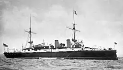 The armored cruiser was developed in the 1870s as an attempt to combine the virtues of the armored ironclad warship and the fast and long-ranged, but unarmored, cruisers of the time. Such a ship was desirable to protect overseas trade and, especially for the French and British, to police their vast overseas empires. The concern within higher naval circles was that without ships that could fulfill these requirements and incorporate new technology, their fleet would become obsolete and ineffective should a war at sea arise.[1] Concern over obsolescence in official circles was further fueled by the race between the increasing size of naval guns and of armor strong enough to withstand such fire. In 1860, one of the largest naval cannons in standard use had a bore of 8 inches (203 mm) and fired a 68-pound (31 kg) solid shot or approximately 51-pound (23 kg) spherical shell. By 1884, guns with as wide a bore as 16.25 inches (413 mm), firing an 1,800-pound (816 kg) exploding shell, were being mounted on naval vessels. This gun could penetrate up to 34 inches of wrought iron, the earliest form of naval armor. These were muzzle-loading guns, as had been used on ships from the 1500s. Breech-loading cannon, which were readopted into naval use in the 1870s, were more destructive than muzzle loaders due to their higher rate of fire. The development of rifled cannon, which improved accuracy, and advancements in shells were other factors. Although a cruiser would not likely face the largest-caliber guns of a battleship and many navies commonly used smaller weapons as they did not wear out as fast as larger ones did, cruisers still needed some form of protection to preclude being shot to pieces.[2]