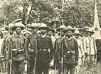 Soldiers and mercenaries trained in the Philippines which were recruited by France which was then in an alliance with Spain, had fought in Cambodia and Vietnam justified by defending newly converted Catholic populations from persecutions and had assisted France in establishing French Cochinchina centered in Saigon.[56] Also in Asia, at China, during the Taiping Rebellion, Filipinos who were described as Manilamen and were 'Reputed to be brave and fierce fighters' and 'were plentiful in Shanghai and always eager for action' were employed by the Foreign forces as mercenaries to successfully quell the Taiping Rebellion.[57][58][59][60] In the opposite side of the world at the Americas, descendants of Filipinos were active in the Anti-Imperialist Wars in the Americas. Filipinos living in Louisiana at the independent settlement of Saint Malo were recruited to be soldiers commanded by Jean Lafitte in the defense of New Orleans during the War of 1812 against a Britain attempting to reconquer a rebel America.[61] "Manilamen" recruited from San Blas together with the Argentinian of French descent, Hypolite Bouchard, joined other nationalities living nearby such as Frenchmen, Mexicans and Americans in the assault of Spanish California during the Argentinian War of Independence.[62][63] Mexicans of Filipino descent being led by Filipino-Mexican General Isidoro Montes de Oca assisted Vicente Guerrero in the Mexican war of independence against Spain. Isidoro Montes de Oca was a celebrated war hero famous for the battle action of the Treasury of Tamo, in Michoacán on September 15, 1818, in which the opposing forces numbered four times greater, yet they were totally destroyed.[64]