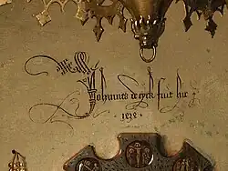The painting is signed, inscribed and dated on the wall above the mirror: "Johannes de eyck fuit hic 1434" ("Jan van Eyck was here 1434"). The inscription looks as if it were painted in large letters on the wall, as was done with proverbs and other phrases at this period. Other surviving van Eyck signatures are painted in trompe-l'œil on the wooden frame of his paintings, so that they appear to have been carved in the wood.[9][11]