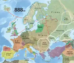 - ^ East Francia had been split from the rest of Frankish Realm by the Treaty of Verdun in 843. It evolved into Holy Roman Empire after end of Carolingian rule.