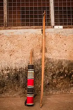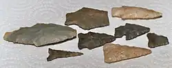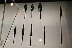 The oldest evidence of likely arrowheads, dating to c. 64,000 years ago, were found in Sibudu Cave, current South Africa.[3][4][5][6][7] Likely arrowheads made from animal bones have been discovered in the Fa Hien Cave in Sri Lanka which are also the oldest evidence for the use of arrows outside of Africa dating to c. 48,000 years ago.[8][9] The oldest evidence of the use of bows to shoot arrows dates to about 10,000 years ago; it is based on pinewood arrows found in the Ahrensburg valley north of Hamburg. They had shallow grooves on the base, indicating that they were shot from a bow.[10] The oldest bow so far recovered is about 8,000 years old, found in the Holmegård swamp in Denmark. Archery seems to have arrived in the Americas with the Arctic small tool tradition, about 4,500 years ago.