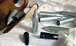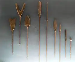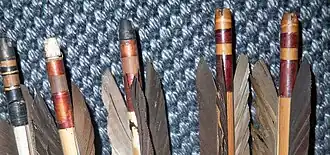 Arrowheads may be attached to the shaft with a cap, a socketed tang, or inserted into a split in the shaft and held by a process called hafting.[11] Points attached with caps are simply slid snugly over the end of the shaft, or may be held on with hot glue. Split-shaft construction involves splitting the arrow shaft lengthwise, inserting the arrowhead, and securing it using a ferrule, sinew, or wire.[24]