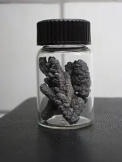 A large variety of organoarsenic compounds are known. Several were developed as chemical warfare agents during World War I, including vesicants such as lewisite and vomiting agents such as adamsite.[44][45][46] Cacodylic acid, which is of historic and practical interest, arises from the methylation of arsenic trioxide, a reaction that has no analogy in phosphorus chemistry. Cacodyl was the first organometallic compound known (even though arsenic is not a true metal) and was named from the Greek κακωδία "stink" for its offensive, garlic-like odor; it is very toxic.[47]