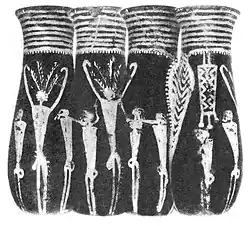 During this period, distinctly foreign objects and art forms entered Egypt, indicating contact with several parts of Asia, particularly with Mesopotamia. Objects such as the Gebel el-Arak Knife handle, which has patently Mesopotamian relief carvings on it, have been found in Egypt,[17] and the silver which appears in this period can only have been obtained from Asia Minor.[16] In addition, Egyptian objects were created which clearly mimic Mesopotamian forms.[18] Cylinder seals appeared in Egypt, as well as recessed paneling architecture. The Egyptian reliefs on cosmetic palettes were made in the same style as the contemporary Mesopotamian Uruk culture, and ceremonial mace heads from the late Gerzean and early Semainean were crafted in the Mesopotamian "pear-shaped" style, instead of the Egyptian native style.[19]