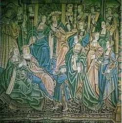 Arthur became Duke of Cornwall at birth.[6] Four days after his birth, he was baptised at Winchester Cathedral by the Bishop of Worcester, John Alcock, which was immediately followed by his confirmation.[3] His godparents were John de Vere, 13th Earl of Oxford; Thomas Stanley, 1st Earl of Derby; William FitzAlan, 16th Earl of Arundel; Arthur's grandmother, Queen Elizabeth Woodville; and his aunt Cecily of York. Elizabeth and Cecily carried the prince during the ceremony.[8] Initially, Arthur's nursery in Farnham was headed by Elizabeth Darcy, who had served as chief nurse for Edward IV's children, including Arthur's own mother. After Arthur was created Prince of Wales in 1489, he was awarded a household structure at the behest of his father.[4] Over the next thirteen years, his parents would have six more children, of whom only three – Margaret, Henry and Mary – would reach adulthood.[9] Arthur was especially close to his sister Margaret (b. 1489) and his brother Henry (b. 1491), with whom he shared a nursery.[10]