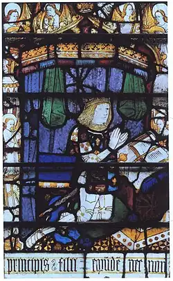 The stained-glass image of Arthur Tudor praying is in the west window of the nave in St Laurence's Church in Ludlow, Shropshire where he died at the castle in 1502.[77] Arthur's bowels (called euphemistically "the heart") had been buried in a lead box in the church's choir but were noted in 1723 as having been taken up not long since.[78]