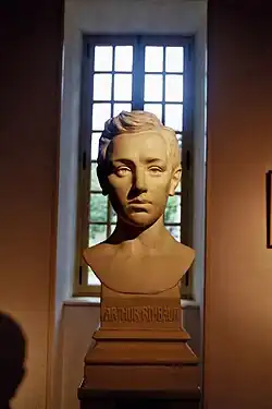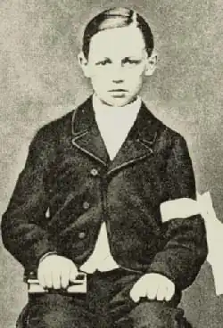 As a boy, Arthur Rimbaud was small and pale with light brown hair, and eyes that his lifelong best friend, Ernest Delahaye, described as "pale blue irradiated with dark blue—the loveliest eyes I've seen".[27] An ardent Catholic like his mother, he had his First Communion when he was eleven. His piety earned him the schoolyard nickname "sale petit Cagot".[28] That same year, he and his brother were sent to the Collège de Charleville. Up to then, his reading had been largely confined to the Bible,[29] though he had also enjoyed fairy tales and adventure stories, such as the novels of James Fenimore Cooper and Gustave Aimard.[30] At the Collège he became a highly successful student, heading his class in all subjects except mathematics and the sciences; his schoolmasters remarked upon his ability to absorb great quantities of material. He won eight first prizes in the French academic competitions in 1869, including the prize for Religious Education, and the following year won seven first prizes.[31]