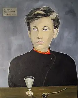 Rimbaud was not well-liked at the time, and many people thought of him as dirty and rude.[61] The artist Henri Fantin-Latour wanted to paint first division poets at the 1872 Salon, but they were not available.[62] He had to settle for Rimbaud and Verlaine, who were described as "geniuses of the tavern".[62] The painting, By the table, shows Rimbaud and Verlaine at the end of the table. Other writers, such as Albert Mérat, refused to be painted with Verlaine and Rimbaud, Mérat's reason being that he "would not be painted with pimps and thieves",[62] in reference to Verlaine and Rimbaud; in the painting, Mérat is replaced by a flower vase on the table.[62] Mérat also spread many rumours in the salons that Verlaine and Rimbaud were sleeping together; the spread of those rumours was the commencement of the fall for the two poets, who were trying to build a good reputation for themselves.[62]