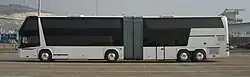 In the mid-1960s, AC Transit in California pioneered the American use of a modern articulated bus, operating the experimental commuter coach "XMC 77" (based on Continental Trailways' Bus & Car Co. Super Golden Eagle model) on some of its transbay lines.[7][8] The XMC-77, which AC Transit dubbed the "Freeway Train", was originally built in 1958, purchased by the District in October 1965, and made its debut run for Line N on 14 March 1966;[9] passengers on the inaugural run were presented with special souvenir tickets. XMC-77 was later exhibited to the public at various locations in the East Bay and the Transbay Terminal. It offered seats for 77 passengers (finished in brown and orange) and an observation lounge, complete with a card table to seat a quartet. The 60 ft (18.3 m) long coach stood 10 ft 10 in (3.30 m) high and was powered by a Cummins engine with an output of 262 hp (195 kW).[9] Engineering for the XMC-77 was carried out by the local firm of DeLeuw Cather & Co.[10]