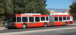 Due to their high passenger capacity, articulated buses are often used as part of bus rapid transit schemes, and can include a mechanical guidance system and electric bus or trolleybus.[3] Articulated buses are typically 18 m (59 ft) long, in contrast to standard rigid buses at 11 to 14 m (36 to 46 ft) long. The common arrangement of an articulated bus is to have a forward section with two axles leading a rear section with a single axle, with the driving axle mounted on either the front or the rear section. Some articulated buses have a steering arrangement on the rearmost axle that turns slightly in opposition to the front steering axle, allowing the vehicle to negotiate tighter turns, similar to hook-and-ladder fire trucks operating in city environments.[4] A less common variant of the articulated bus is the bi-articulated bus, where the vehicle has two trailer sections rather than one. Such vehicles have a capacity of around 200 people, and a length of about 25 m (82 ft); as such, they are used almost exclusively on high-capacity, high-frequency arterial routes and on bus rapid transit services.