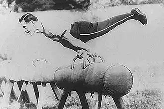 The balance beam existed as early as the 1880s in the form of a "low beam" close to the floor.[33] By the 1920s, the beam was raised much higher due to Swedish influence on the sport.[33]