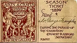 In 1887, the Arts and Crafts Exhibition Society, which gave its name to the movement, was formed with Walter Crane as president, holding its first exhibition in the New Gallery, London, in November 1888.[53] It was the first show of contemporary decorative arts in London since the Grosvenor Gallery's Winter Exhibition of 1881.[54] Morris & Co. was well represented in the exhibition with furniture, fabrics, carpets and embroideries. Edward Burne-Jones observed, "here for the first time one can measure a bit the change that has happened in the last twenty years".[55] The society still exists as the Society of Designer Craftsmen.[56]