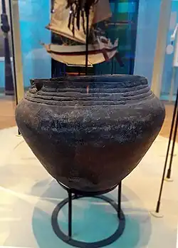The Caquetío people were buried in clusters, both within and potentially outside village boundaries. At times, there was a secondary burial, possibly reserved for exceptional individuals. In the primary burial, the deceased were buried in a large pot, covered with a smaller pot placed on top. In a secondary burial, the body was initially buried without a pot, and after a few months or years, the bones were exhumed and reburied in smaller pots for a second time. Some pots contained grave offerings such as axes, shells, and pottery. The secondary burial method was practised until recently in South America. The striking similarity between the Neo-Indian burial practices in Aruba and the post-Columbian variant in Guajira justifies the assumption that the similar beliefs about life after death existed in both societies.[14]