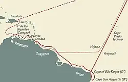 In 1500, Juan de la Cosa drew the first map of the New World, which depicted the two Leeward Antilles known at the time. This was followed by the more accurate Cantino map, created anonymously in 1502, which also showed an extensive landmass and mentioned the Isla do gigante (Island of Giants) and Isla do brasil (Island of Brasil). The location of the Isla do gigante southwest of the Isla do brasil suggest that it refers to Bonaire and Curaçao since Aruba is located more to the northwest.[35]