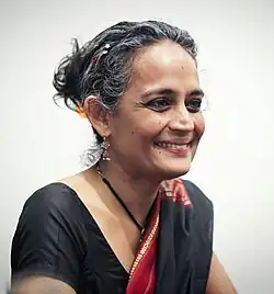 Suzanna Arundhati Roy (Bengali pronunciation: [orundʱoti rae̯]; born 24 November 1961)[1] is an Indian author best known for her novel The God of Small Things (1997), which won the Booker Prize for Fiction in 1997 and became the biggest-selling book by a non-expatriate Indian author.[1] She is also a political activist involved in human rights and environmental causes.[6] She was the winner of the 2024 PEN Pinter Prize, given by English PEN,[7] and she named imprisoned British-Egyptian writer and activist Alaa Abd El-Fattah as the "Writer of Courage" with whom she chose to share the award.[8]