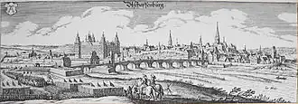 In 1552, the late-Gothic castle of Johannisburg was destroyed. It was replaced in 1605-14 by the Renaissance Schloss Johannisburg.[4]: 57 The town suffered greatly during the Thirty Years' War, being held in turn by the various belligerents. During the Battle of Dettingen (1743), which took place to the north, the town was occupied by French troops. It formed part of the electorate of the Archbishop of Mainz, and in 1803 was made over to Archbishop Karl Theodor von Dalberg as the Principality of Aschaffenburg.