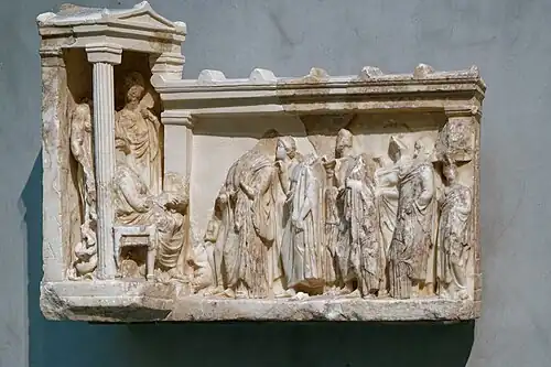 Votive relief of Asclepius, Epione and Hygieia. Mid-4th cent. BC, Acropolis Museum, Athens.