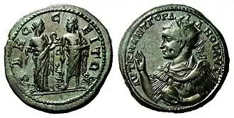 Roman coin from Odessos showing Asclepius with Hygieia on one side and Gordian III's portrait on the other side (35mm, 28g)
