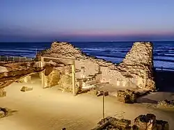 Ashdod-Yam, later known as Azotos Paralios, appears to have been first settled in the Bronze Age, gradually gaining in importance through the Iron Age.[11] In the Byzantine period the port town overshadowed in importance the city further inland: the bishops of Azotos present at the council of 325 and the council of Jerusalem in 536 seem to have resided in Azotos Paralios rather than in Azotos Mesogeios.[11][12] The prominence of Hellenised, then Christian Azotus continued until the 7th century, when it came under Muslim rule. The city was represented at the Council of Chalcedon by Heraclius of Azotus. A coastal fort "Minat al-Qal'a" (lit. 'the port with the castle') was erected by the Umayyad Caliph Abd al-Malik, the builder of the Dome of the Rock, at or near the former Azotus Paralios,[13] which was later reconstructed by the Fatimids and Crusaders.[14] The port city stops being mentioned during the Ayyubid and Mamluk periods, making it likely that it was destroyed due to fears that they might again be used by Crusader invasions from the sea.[14]