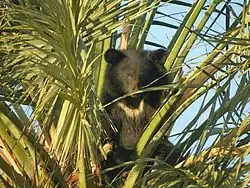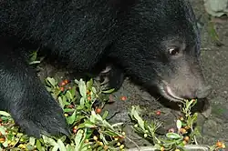 The Asian black bear is omnivorous and feeds on insects, beetle larvae, invertebrates, termites, grubs, carrion, bees, eggs, garbage, mushrooms, grasses, bark, roots, tubers, fruits, nuts, seeds, honey, herbs, acorns, cherries, dogwood and grain.[34][12] It eats pine nuts and acorns of the previous year in the April–May period. In times of scarcity, it enters river valleys to gain access to hazelnuts and insect larvae in rotting logs. From mid-May through late June, it supplement its diet with green vegetation and fruit. Through July to September, it climbs trees to eat bird cherries, pine cones, vines and grapes. On rare occasions, it eats dead fish during the spawning season, though this constitutes a much lesser portion of its diet.[2] In the 1970s, Asian black bears were reported to kill and eat Hanuman langurs in Nepal.[46] Although herbivorous to a greater degree than the brown bear,[2] and more carnivorous than the American black bear,[24] the Asian black bear is not as specialized but more opportunistic, gorging on a variety of seasonal high calorie foods, storing the excess calories as fat, and then hibernates during times of scarcity.[47] It also kills ungulates with some regularity, including domestic livestock.[48] Wild ungulate prey can include muntjacs, serow, takin, Malayan tapir[49] wild boar[50] and adult water buffaloes, which it kills by breaking their necks.[51]