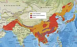 During the Middle Pleistocene and early Late Pleistocene, the Asian black bear ranged from the Iberian Peninsula,[30] the Balkans[31] to the Ural Mountains.[32] Today, it occurs very patchily in its former range from southeastern Iran eastward through Afghanistan and Pakistan,[12] across the foothills of the Himalayas in India and Myanmar to mainland Southeast Asia, except Malaysia. Its range in mainland China is patchy in the northeast and south, Hainan, and it is absent in much of east-central China. Other population clusters exist in Taiwan, the southern Russian Far East and in North Korea. Small remnant populations survive in South Korea, and on Honshu and Shikoku islands.[1][33] It typically inhabits deciduous forests, mixed forests and thornbrush forests.[12] In the summer, it usually inhabits elevations of around 3,500 m (11,480 ft) in the Himalayas but rarely above 3,700 m (12,000 ft). In winter, it descends to elevations below 1,500 m (4,920 ft). In Japan, it also occurs at sea level.[34]