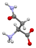 The determination of asparagine's structure required decades of research. The empirical formula for asparagine was first determined in 1833 by the French chemists Antoine François Boutron Charlard and Théophile-Jules Pelouze; in the same year, the German chemist Justus Liebig provided a more accurate formula.[11][12] In 1846 the Italian chemist Raffaele Piria treated asparagine with nitrous acid, which removed the molecule's amine (–NH2) groups and transformed asparagine into malic acid.[13] This revealed the molecule's fundamental structure: a chain of four carbon atoms. Piria thought that asparagine was a diamide of malic acid;[14] however, in 1862 the German chemist Hermann Kolbe showed that this surmise was wrong; instead, Kolbe concluded that asparagine was an amide of an amine of succinic acid.[15] In 1886, the Italian chemist Arnaldo Piutti (1857–1928) discovered a mirror image or "enantiomer" of the natural form of asparagine, which shared many of asparagine's properties, but which also differed from it.[16] Since the structure of asparagine was still not fully known – the location of the amine group within the molecule was still not settled[17] – Piutti synthesized asparagine and thus published its true structure in 1888.[18]