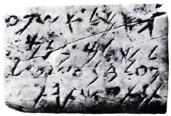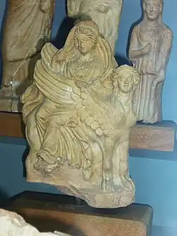 Other significant locations where she was introduced by Phoenician sailors and colonists were Cythera, Malta, and Eryx in Sicily from which she became known to the Romans as Venus Erycina. Three inscriptions from the Pyrgi Tablets dating to about 500 BC found near Caere in Etruria mentions the construction of a shrine to Astarte in the temple of the local goddess Uni-Astre (𐌔𐌄𐌓𐌕𐌔𐌀𐌋𐌀𐌉𐌍𐌖).[23][24] At Carthage Astarte was worshipped alongside the goddess Tanit, and frequently appeared as a theophoric element in personal names.[25]