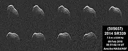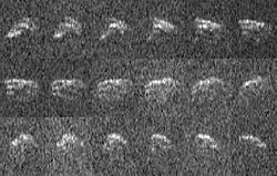 Many asteroids have natural satellites (minor-planet moons). As of October 2021, there were 85 NEAs known to have at least one moon, including three known to have two moons.[58] The asteroid 3122 Florence, one of the largest potentially hazardous asteroids with a diameter of 4.5 km (2.8 mi), has two moons measuring 100–300 m (330–980 ft) across, which were discovered by radar imaging during the asteroid's 2017 approach to Earth.[59]