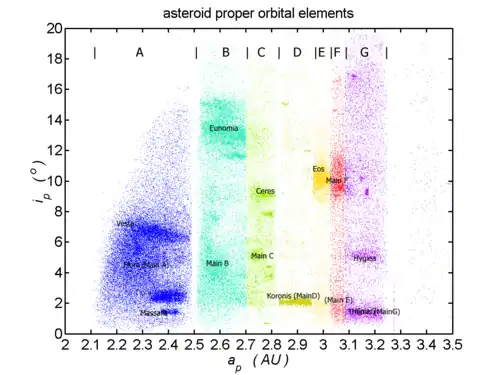 - ^ a b c d e f g h i j k l m n o p q r s t u v w x y z aa ab Knezevic, Zoran; Milani, Andrea; Cellino, Alberto; Novakovic, Bojan; Spoto, Federica; Paolicchi, Paolo (July 2014). "Automated Classification of Asteroids into Families at Work". Complex Planetary Systems. 310: 130–133. Bibcode:2014IAUS..310..130K. doi:10.1017/S1743921314008035.