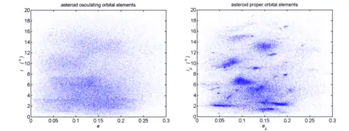 Strictly speaking, families and their membership are identified by analysing the proper orbital elements rather than the current osculating orbital elements, which regularly fluctuate on timescales of tens of thousands of years. The proper elements are related constants of motion that remain almost constant for at least tens of millions of years, and perhaps longer.
