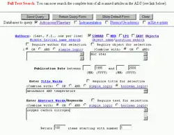 The search engine allows selection logic both within fields and between fields. Search terms in each field can be combined with OR, AND, simple logic or Boolean logic, and the user can specify which fields must be matched in the search results. This allows complex searches to be built; for example, the user could search for papers concerning NGC 6543 OR NGC 7009, with the paper titles containing (radius OR velocity) AND NOT (abundance OR temperature).