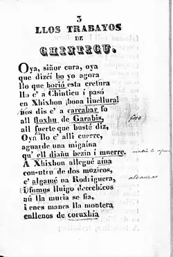 The first book in Asturian printed and published was Llos Trabayos de Chinticu by Juan Junquera Huergo, published in Gijón in 1843 composed of 372 satirical verses.[28][29] Junquera Huergo, former mayor of Gijón, also wrote the first Asturian grammar in 1869, using a writing standard invented by himself, but was left unpublished due to lack of funds after Junquera's death,[30] and two dictionaries, a Diccionario del dialecto asturiano in 1867 and a Spanish-Asturian dictionary that was left uncompleted (only up to the letter "E").[26][31] In 1880 another very small dictionary would be written (Pequeño vocabulario de voces en bable), the writer is unknown,[26] but it's attributed to José Fernández-Quevedo y González-Llanos alias "Pepín Quevedo".[32]