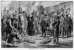 "The execution of Atahualpa Inca in Cajamarca: they behead him", drawn in 1615 by the chronicler Guaman Poma[11]