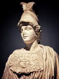 The Athena Giustiniani, a Roman copy of a Greek statue of Pallas Athena. The guardian serpent of the Athenian Acropolis sits coiled at her feet.[138]