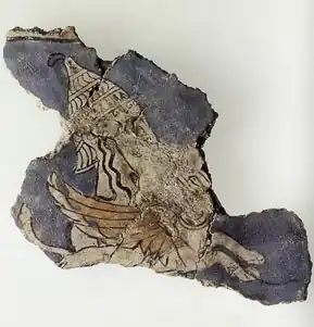 Fragment of a fresco from the Cult Center at Mycenae dating the late thirteenth century BC depicting a warrior goddess, possibly Athena, wearing a boar's tusk helmet and clutching a griffin.[11]