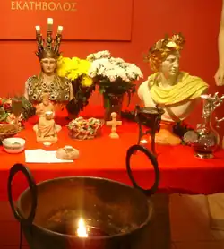 In her aspect of Athena Polias, Athena was venerated as the goddess of the city and the protectress of the citadel.[13][80][43] In Athens, the Plynteria, or "Feast of the Bath", was observed every year at the end of the month of Thargelion.[81] The festival lasted for five days. During this period, the priestesses of Athena, or plyntrídes, performed a cleansing ritual within the Erechtheion, a sanctuary devoted to Athena and Poseidon.[82] Here Athena's statue was undressed, her clothes washed, and body purified.[82] Athena was worshipped at festivals such as Chalceia as Athena Ergane,[83][43] the patroness of various crafts, especially weaving.[83][43] She was also the patron of metalworkers and was believed to aid in the forging of armor and weapons.[83] During the late fifth century BC, the role of goddess of philosophy became a major aspect of Athena's cult.[84]