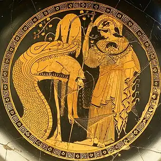 Attic red-figure kylix painting from c. 480-470 BC showing Athena observing as the Colchian dragon disgorges the hero Jason[153]