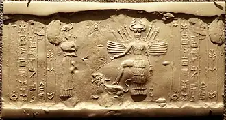 Ancient Akkadian cylinder seal (dating c. 2334–2154 BC) depicting Inanna, the goddess of war, armored and carrying weapons, resting her foot on the back of a lion[27]