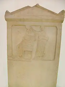 In addition to being barred from any form of formal participation in government, women were also largely left out of public discussions and speeches, with orators going as far as leaving out the names of wives and daughters of citizens or finding roundabout ways of referring to them.[40] Pushed out of the public sphere, women's role was confined to the private sphere of working in the home and being cast as a second-rate human, subservient to her male guardian, whether that be a father or husband.[41]