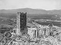 The Turks began a practice of storing gunpowder and explosives in the Parthenon and Propylaea. In 1640, a lightning bolt struck the Propylaea, causing its destruction.[48] In 1687, during the Morean War, the Acropolis was besieged by the Venetians under Francesco Morosini, and the temple of Athena Nike was dismantled by the Ottomans to fortify the Parthenon. A shot fired during the bombardment of the Acropolis caused a powder magazine in the Parthenon to explode (26 September), and the building was severely damaged, giving it largely the appearance it has today. The Venetian occupation of Athens lasted for six months, and both the Venetians and the Ottomans participated in the looting of the Parthenon. One of its western pediments was removed, causing even more damage to the structure.[35][45] During the Venetian occupation, the two mosques of the city were converted into Catholic and Protestant churches, but on 9 April 1688 the Venetians abandoned Athens again to the Ottomans.[45]