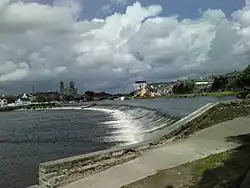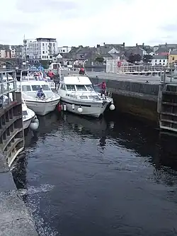 Athlone is a common stop for pleasure craft along the River Shannon. Lough Ree, the largest lake on the Shannon, is a short distance upstream from Athlone, and many boat companies are based out of the town. For craft to pass through Athlone, it is necessary to use a lock in the river, which is beside the weir and downstream of the current road bridge. The lock, weir, and bridge were all constructed by the Shannon navigation commissioners in the 1840s. Before then, boats used a canal, about a mile and a half long, to the west of the river. The canal was built by Thomas Omer for the Commissioners of Inland Navigation.[16] Work started in 1757 and involved the work of over 300 men. Omer built a single lock, 120' X 19' with a rise of 4.5', but there was also a guard lock, further upstream, with a single set of gates to protect the canal against floods. There were also two lay-bys, or harbours, one above the lock and another at the upstream end. The old canal is no longer navigable.
