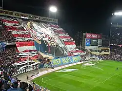 Simeone led Atlético to their second Europa League win in the three years since its creation; Atlético beat Athletic Bilbao 3–0 in the final on 9 May 2012 at National Arena in Bucharest with two goals from Radamel Falcao and one from Diego.[81][82] By winning the Europa League again, Atlético qualified for the 2012 UEFA Super Cup against Chelsea, winners of the previous season's Champions League. The game was played at the Stade Louis II, Monaco on 31 August 2012; Atlético won 4–1, including a hat-trick by Falcao in the first half. On 17 May 2013, Atlético beat Real Madrid 2–1 in the Copa del Rey final in a tense match where both teams finished with ten men. This ended a 14-year and 25-match winless streak in the Madrid derby. The 2012–13 season saw the club finish with three trophies in a little over a year.[83][84] On 17 May 2014, a 1–1 draw at the Camp Nou against Barcelona secured the La Liga title for Atlético, their first since 1996, and the first titles since 2003–04 not won by Barcelona or Real Madrid.[85] One week later, Atlético faced city rivals Real Madrid in their first Champions League final since 1974, and the first played between two sides from the same city. They took a first-half lead through Godín and led until the third minute of injury time, when Sergio Ramos headed in an equaliser from a corner; the match went to extra time, and Real ultimately won 4–1.[86]