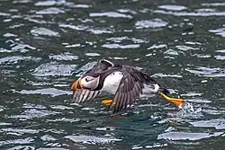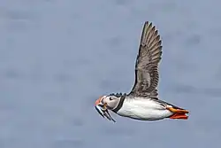 The Atlantic puffin diet consists almost entirely of fish, though examination of its stomach contents shows that it occasionally eats shrimp, other crustaceans, molluscs, and polychaete worms, especially in more coastal waters.[26] When fishing, it swims underwater using its semi-extended wings as paddles to "fly" through the water and its feet as a rudder. It swims fast and can reach considerable depths and stay submerged for up to a minute. It can eat shallow-bodied fish as long as 18 cm (7 in), but its prey is commonly smaller fish, around 7 cm (3 in) long. An adult bird needs to eat an estimated 40 of these per day – sand eels, herring, capelin,[27][28] and sprats being the most often consumed.