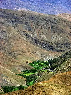 The High Atlas in central Morocco rises in the west at the Atlantic coast and stretches in an eastern direction to the Moroccan-Algerian border. It has several peaks over 4,000 m (13,000 ft), including the highest summit in North Africa, Toubkal (4,167 m or 13,671 ft), and further east Ighil m'Goun (4,071 m or 13,356 ft), the second major summit of the range. At the Atlantic and to the southwest, the range drops abruptly and makes a transition to the coast and the Anti-Atlas range. To the north, in the direction of Marrakesh, the range descends less abruptly. On the heights of Ouarzazate the massif is cut through by the Draa Valley which opens southward. It is mainly inhabited by Berber people, who live in small villages and cultivate the high plains of the Ourika Valley. Near Barrage Cavagnac[9] there is a hydroelectric dam that has created the artificial lake Lalla Takerkoust. The lake serves also as a source for fish for the local fishermen.
