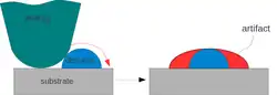 As with any other imaging technique, there is the possibility of image artifacts, which could be induced by an unsuitable tip, a poor operating environment, or even by the sample itself, as depicted on the right. These image artifacts are unavoidable; however, their occurrence and effect on results can be reduced through various methods. Artifacts resulting from a too-coarse tip can be caused for example by inappropriate handling or de facto collisions with the sample by either scanning too fast or having an unreasonably rough surface, causing actual wearing of the tip.