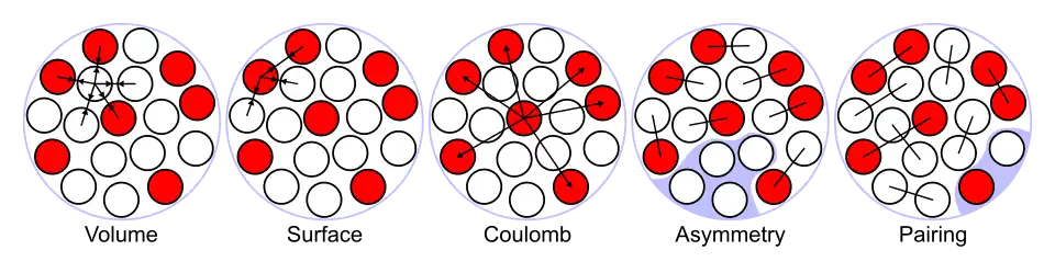 The terms in the semi-empirical mass formula, which can be used to approximate the binding energy of many nuclei, are considered as the sum of five types of energies (see below). Then the picture of a nucleus as a drop of incompressible liquid roughly accounts for the observed variation of binding energy of the nucleus: