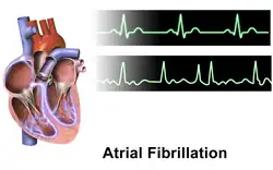 Atrial fibrillation (AF, AFib or A-fib) is an abnormal heart rhythm (arrhythmia) characterized by rapid and irregular beating of the atrial chambers of the heart.[11] It often begins as short periods of abnormal beating, which become longer or continuous over time.[4] It may also start as other forms of arrhythmia such as atrial flutter that then transform into AF.[12]