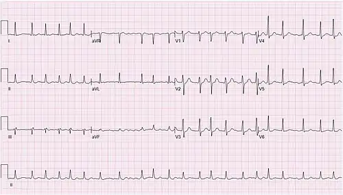 Other risk factors include excess alcohol intake, tobacco smoking, diabetes mellitus, subclinical hypothyroidism, and thyrotoxicosis.[3][7][22][20] However, about half of cases are not associated with any of these aforementioned risks.[3] Healthcare professionals might suspect AF after feeling the pulse and confirm the diagnosis by interpreting an electrocardiogram (ECG).[8] A typical ECG in AF shows irregularly spaced QRS complexes without P waves.[8]