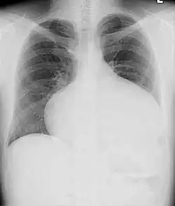 Adults with an uncorrected ASD present with symptoms of dyspnea on exertion (shortness of breath with minimal exercise), congestive heart failure, or cerebrovascular accident (stroke). They may be noted on routine testing to have an abnormal chest X-ray or an abnormal ECG and may have atrial fibrillation. If the ASD causes a left-to-right shunt, the pulmonary vasculature in both lungs may appear dilated on chest X-ray, due to the increase in pulmonary blood flow.[36]