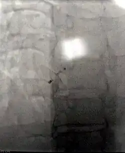 Percutaneous device closure involves the passage of a catheter into the heart through the femoral vein guided by fluoroscopy and echocardiography.[14] An example of a percutaneous device is a device which has discs that can expand to a variety of diameters at the end of the catheter. The catheter is placed in the right femoral vein and guided into the right atrium. The catheter is guided through the atrial septal wall and one disc (left atrial) is opened and pulled into place. Once this occurs, the other disc (right atrial) is opened in place and the device is inserted into the septal wall. This type of PFO closure is more effective than drug or other medical therapies for decreasing the risk of future thromboembolism.[14][50][51] The most common adverse effect of PFO device closure is new-onset atrial fibrillation.[52] Other complications, all rare, include device migration, erosion and embolization and device thrombosis or formation of an inflammatory mass with risk for recurrent ischemic stroke.[53][54]
